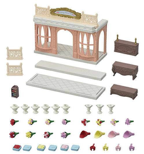 【商品内容】本体、天井、通路、柵x2、カウンター、棚A、棚B、リボンラック、リボンx2、バラ4種、チューリップ4種、ガーベラ4種、バラの葉x4、チューリップの葉x4、ガーベラの葉x4、ラッピングパーツx4、ブーケホルダーx4、バラのギフトボックス3種、フタx3、森のおはなし 【本体サイズ】(約):幅400mm ×奥行き200mm ×高さ350mm ○メーカー:エポック社 ○対象年齢:3歳以上 ○備考:写真はイメージです。